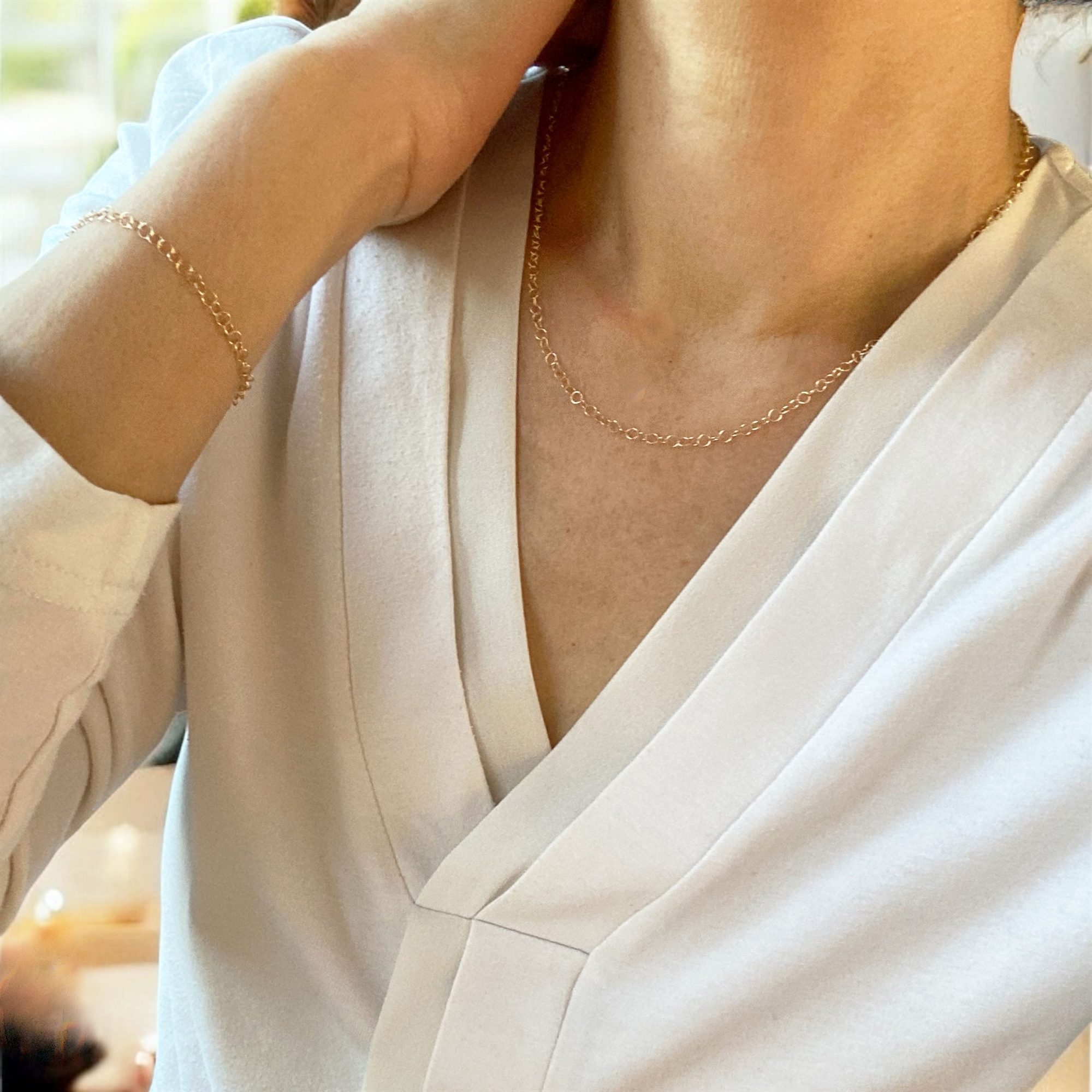 This set can complement your work attire. The 14kt gold maintains its appearance with regular use, which is beneficial for those who wear jewelry daily. The adjustable length allows you to adapt the necklace to different necklines and the bracelet to various sleeve styles.