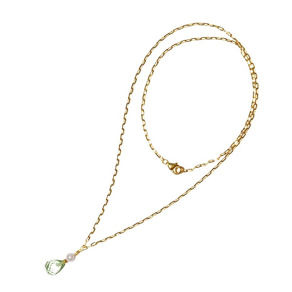 This 14kt gold necklace features a green amethyst pendant and a freshwater pearl. The 45 cm chain allows for versatile wear with different necklines.