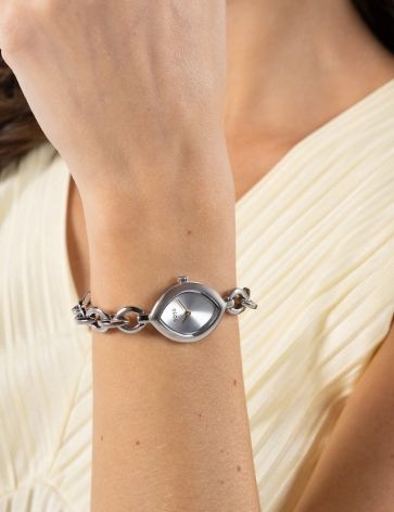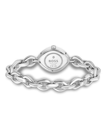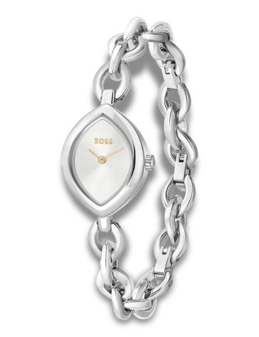 The BOSS Fiora 1502837 is a refined and feminine timepiece featuring a sleek silver-tone bracelet and a delicate dial with sparkling details.