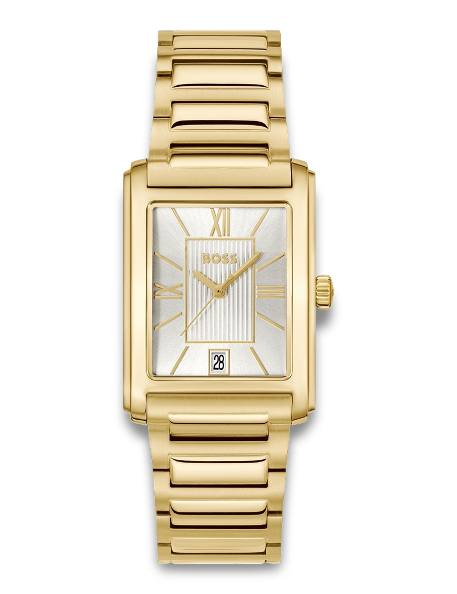 The BOSS Desk Quartz watch combines sophisticated design with practical functionality. The luxurious gold-tone metallic bracelet creates a striking presence, perfectly complementing both formal suits and business attire. Its distinctive rectangular face, featuring Roman numerals, projects an architectural boldness that makes a confident statement in professional settings.