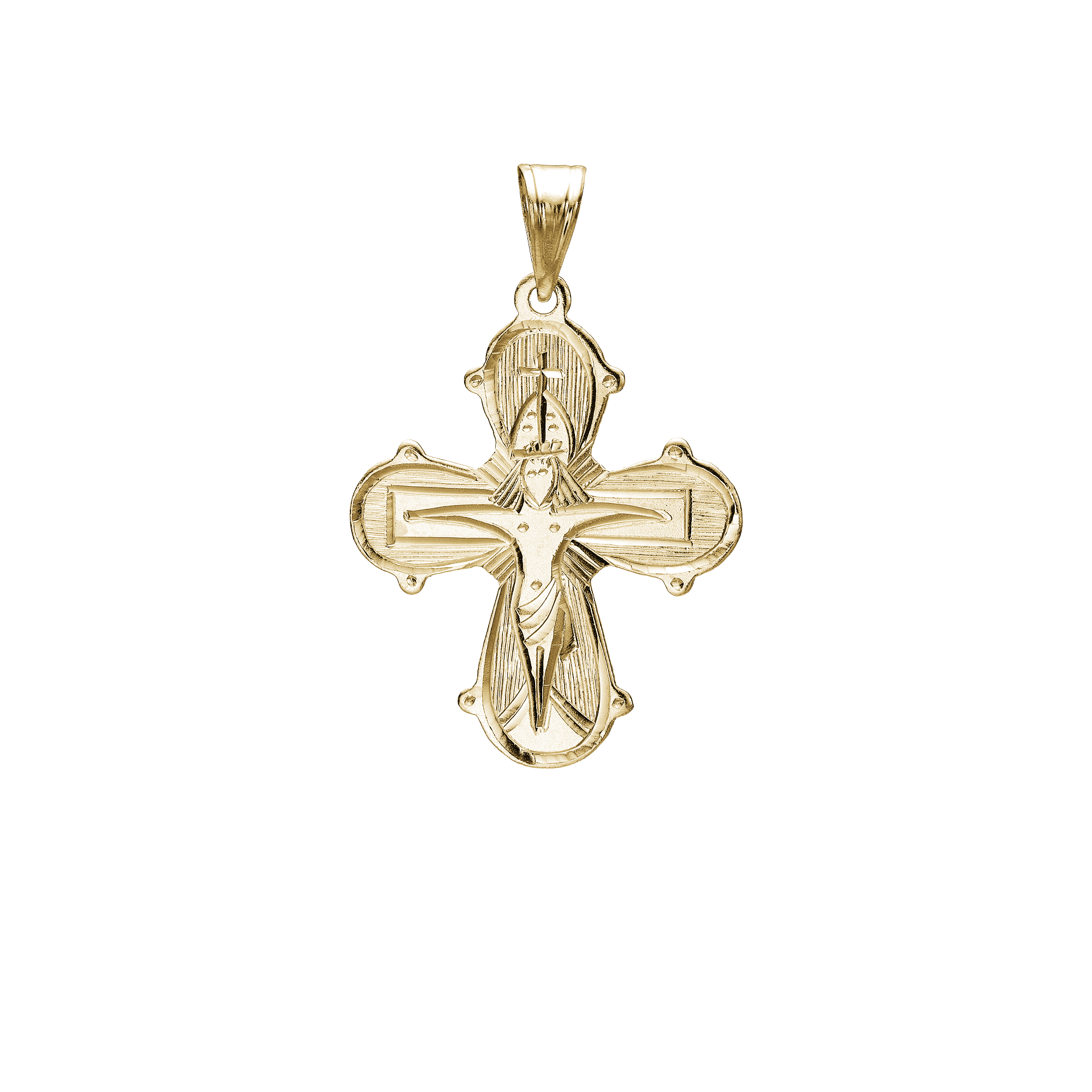 Gold cross pendant with religious figure, rounded edges, and chain loop at top.