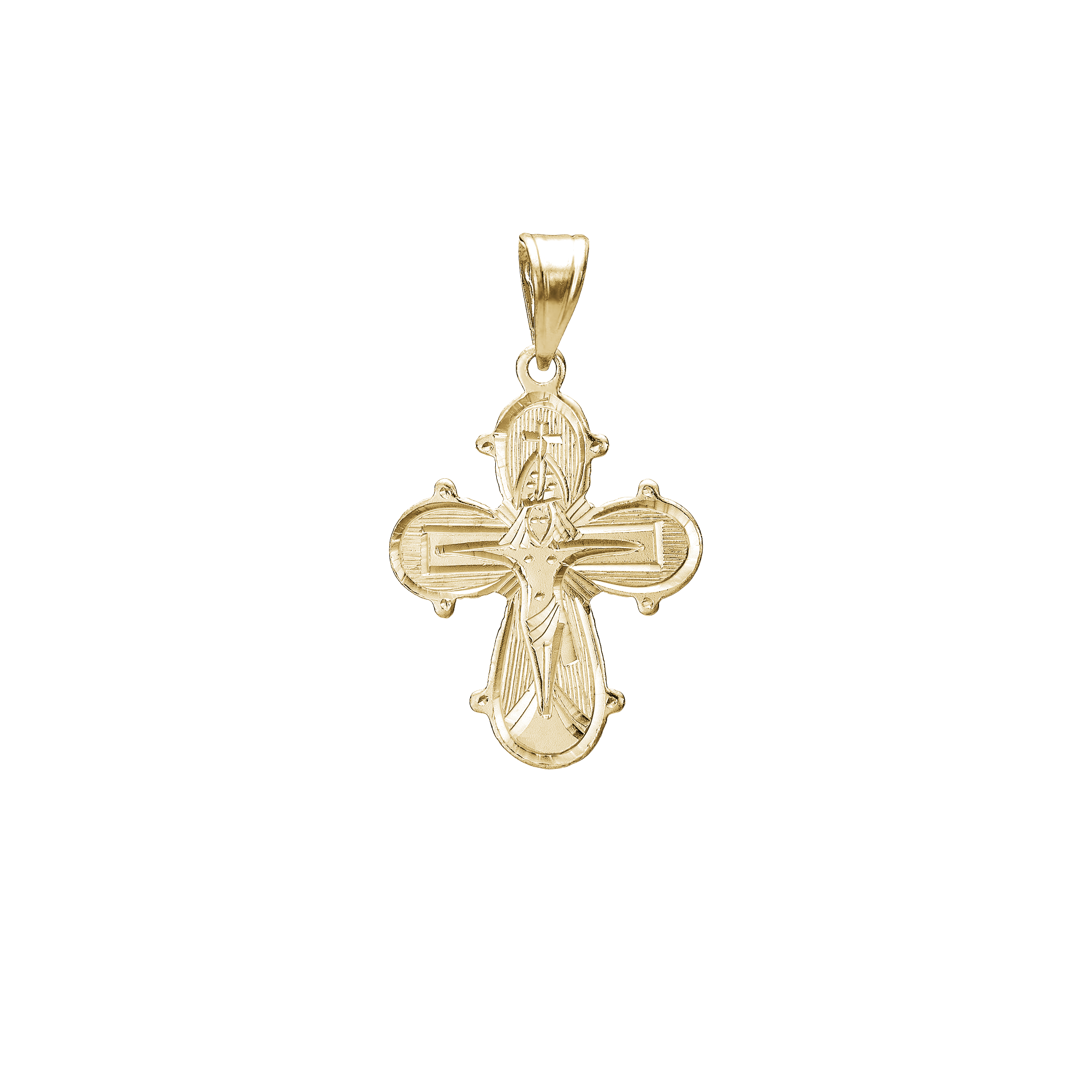 Gold cross pendant with engraved figure in center and loop at top for attaching to a chain.