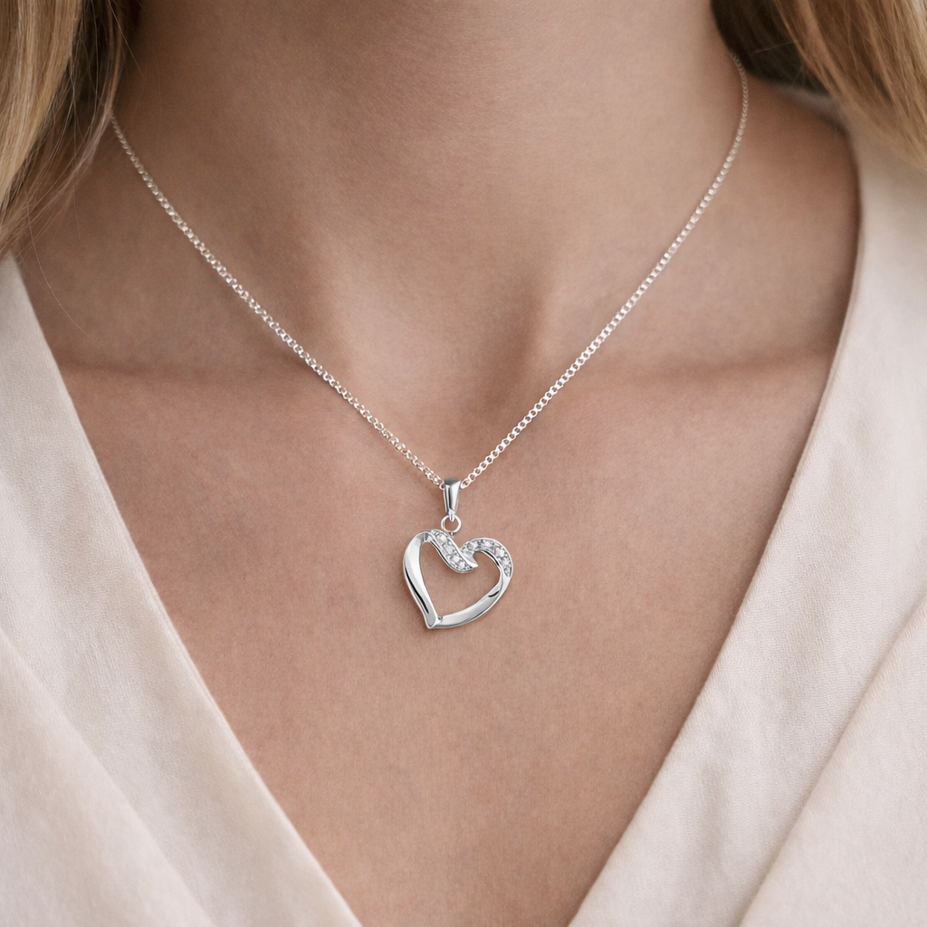 9 ct hand turned white gold heart pendant with 3 pcs 0,005 ct diamonds - great heart for the price ! width 17,8 mm height 16,2 mm can fit on both white gold and red gold chains up to large thicknesses, +2,0 mm Comes in a nice WatchandJewelery.shop gift box with a 42 cm white gold rhodium plated copper chain See our matching earring below