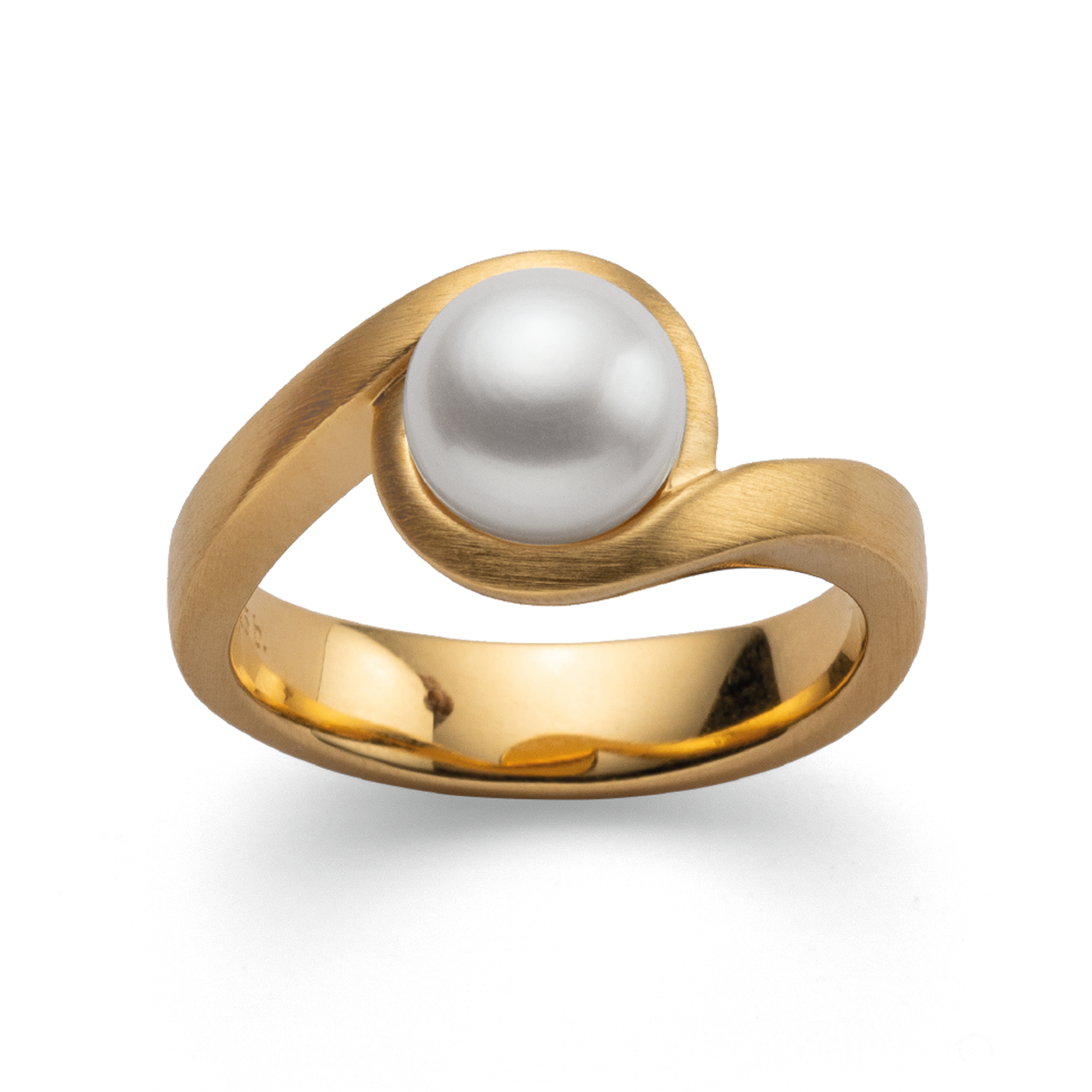 En overdådig perlebeklædning indrammet i sølv møder et sensuelt, buet formsprog. Denne matterede ring lavet af forgyldt 925 sterling sølv og poleret på indersiden af ​​ringbåndet imponerer med sin højkvalitets udførelse og brugen af ​​naturlige, ædle n