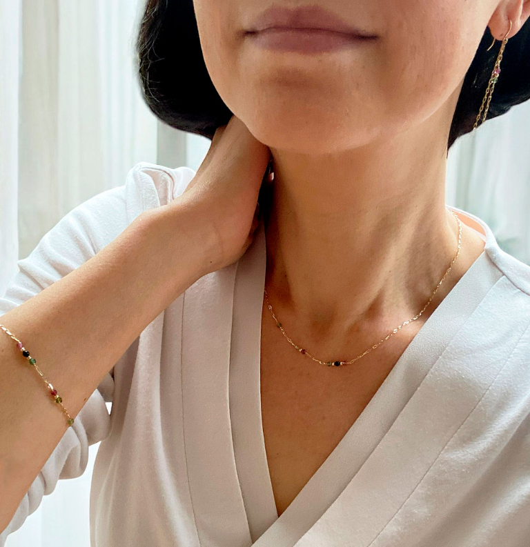 This 9kt gold bracelet features tourmaline beads in yellow, green, and pink. If you are looking for jewelry that is suitable for both studio and gallery events, this is what you have been searching for.