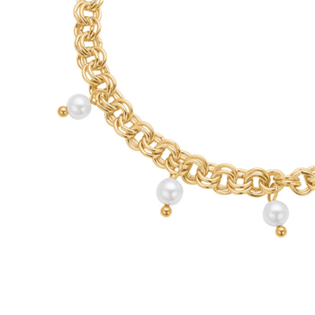 Feminin ankelkæde i stål, belagt med 14 karat guld med små fine shell pearls. Ankelkæden er 25 cm + 4 cm i forlænger. Vandfast med unik holdbarhed.