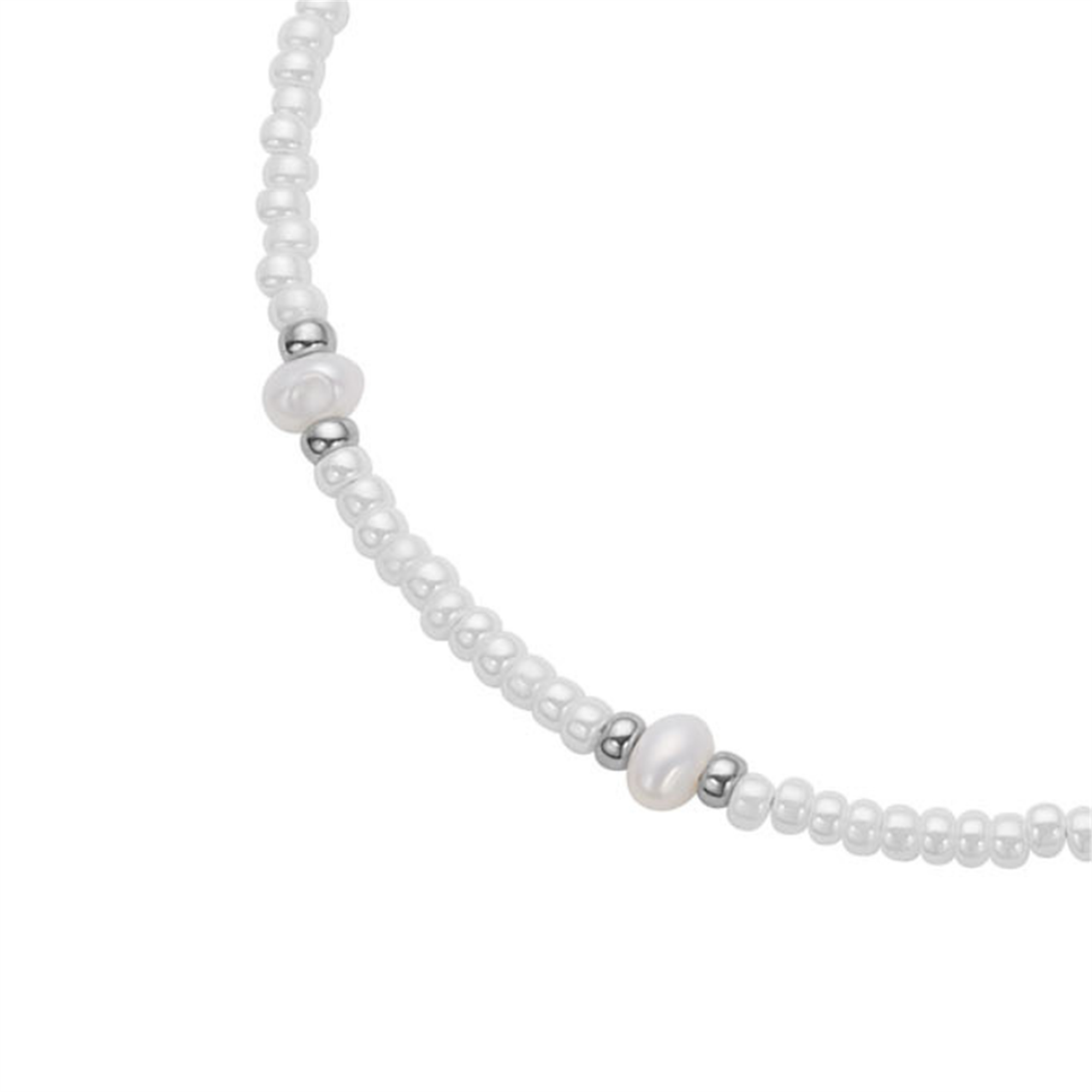 Armbånd i stål med ferskvandskulturperler og miyuki sten. Armbåndet er 17 cm + 5 cm forlænger.