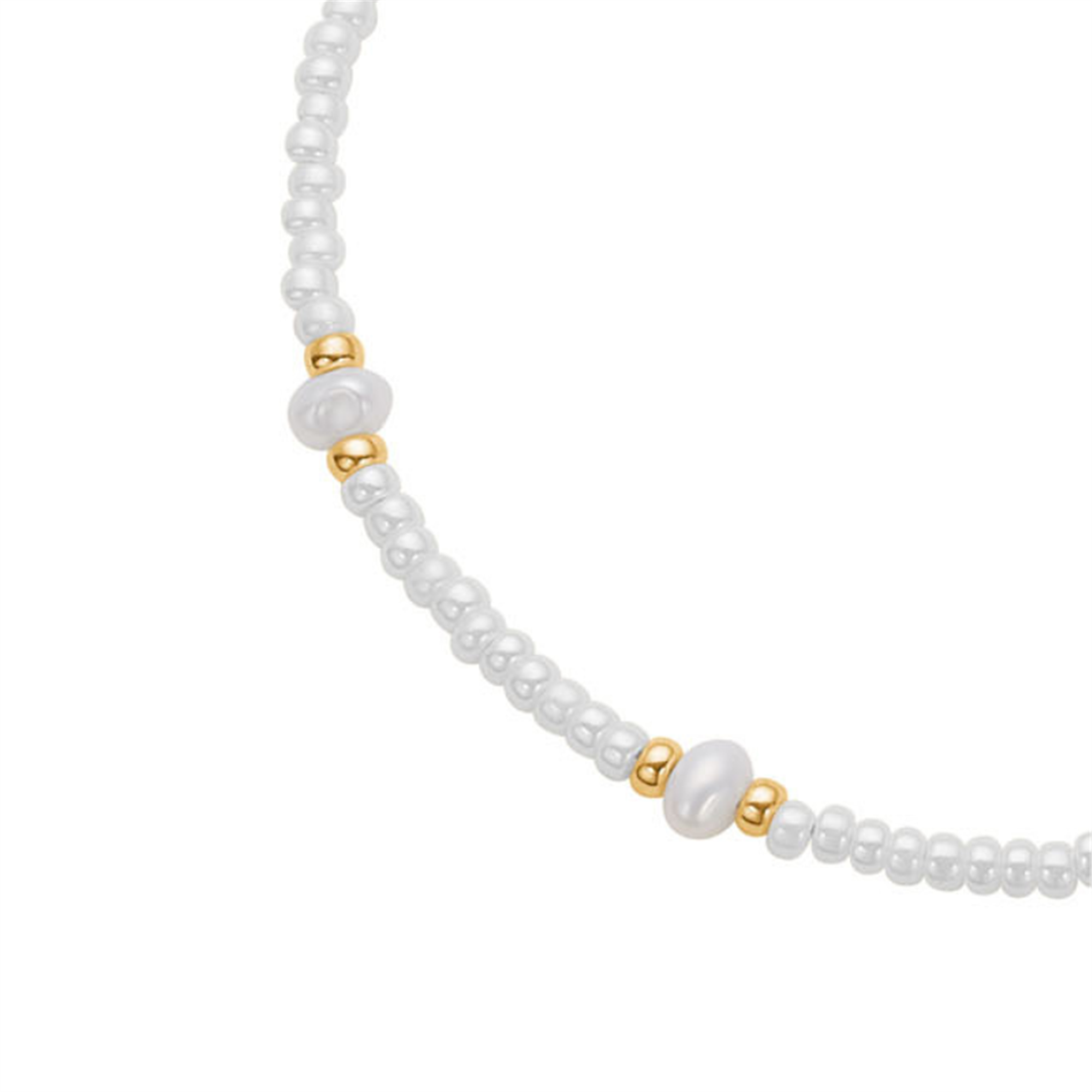 Armbånd i stål, belagt med 14 karat guld med ferskvandskulturperler og miyuki sten. Armbåndet er 17 cm + 5 cm forlænger. Vandfast med unik holdbarhed.