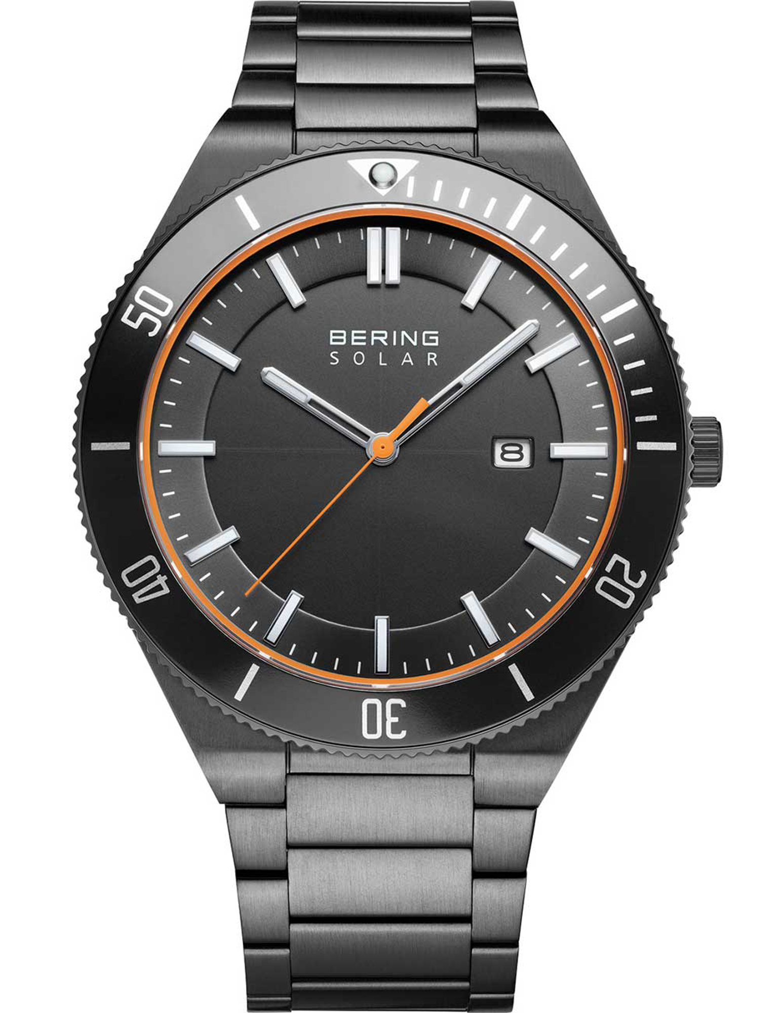 Bering 14443-779 solar watch with black dial, orange accents, date at 3 o\'clock, metal bracelet.