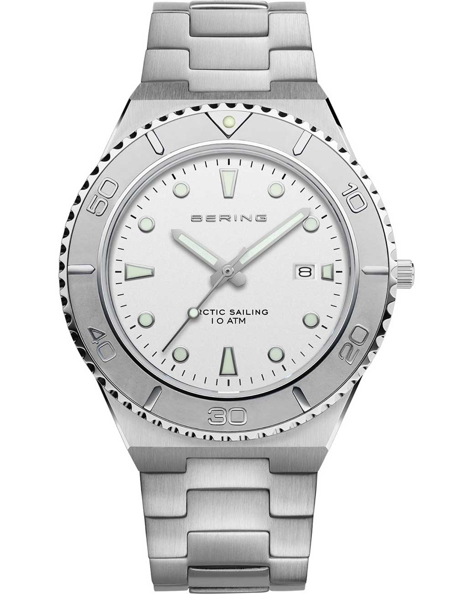 Silver watch with round face, date window, hour markers, "ARCTIC SAILING 10 ATM", metal bracelet.