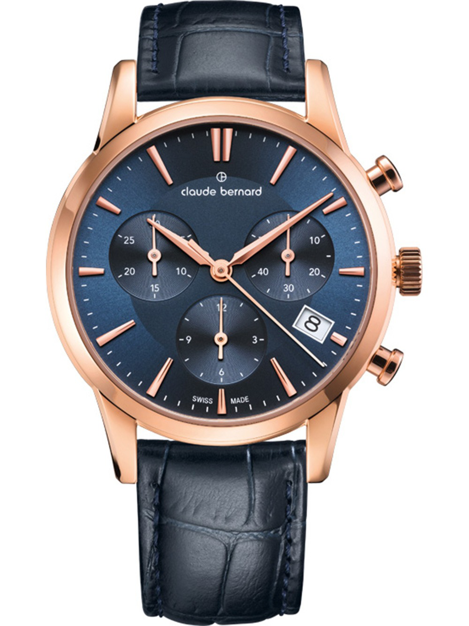 Claude Bernard watch, blue dial, rose-gold case, sub-dials, date at 4 o\'clock, blue leather strap.