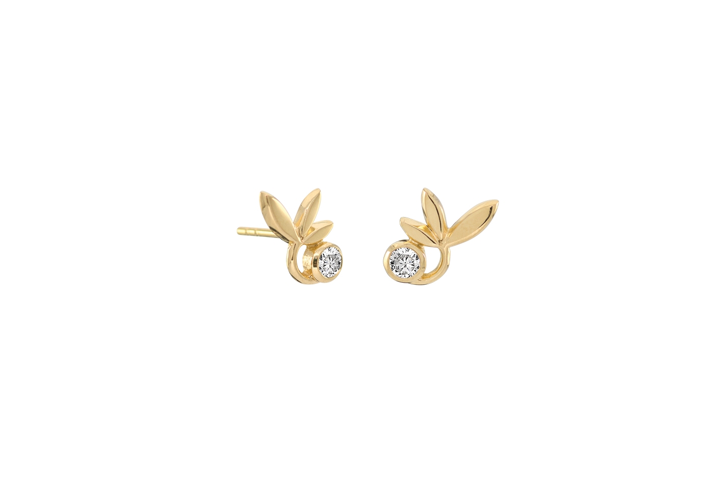 Gold earrings with three-leaf design and a small round gemstone at the base.
