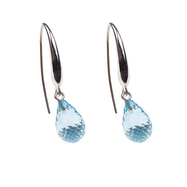 Earrings with drop-shaped blue topaz measuring 12x8mm, hanging from rhodium-plated hooks.