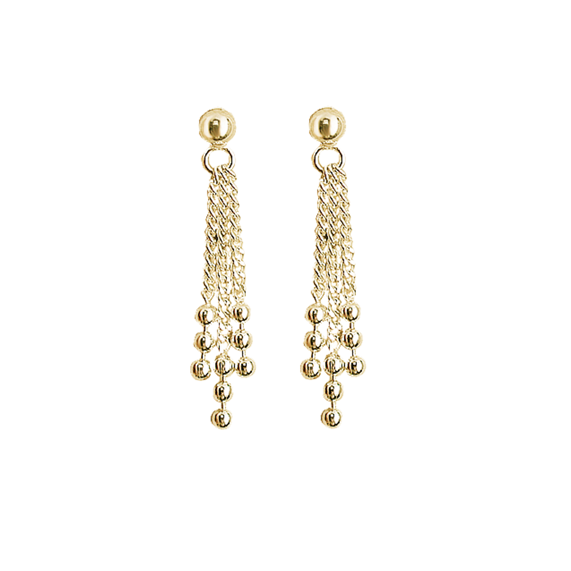 Gold earrings with spherical studs, cascading chains, and small beads at chain ends.