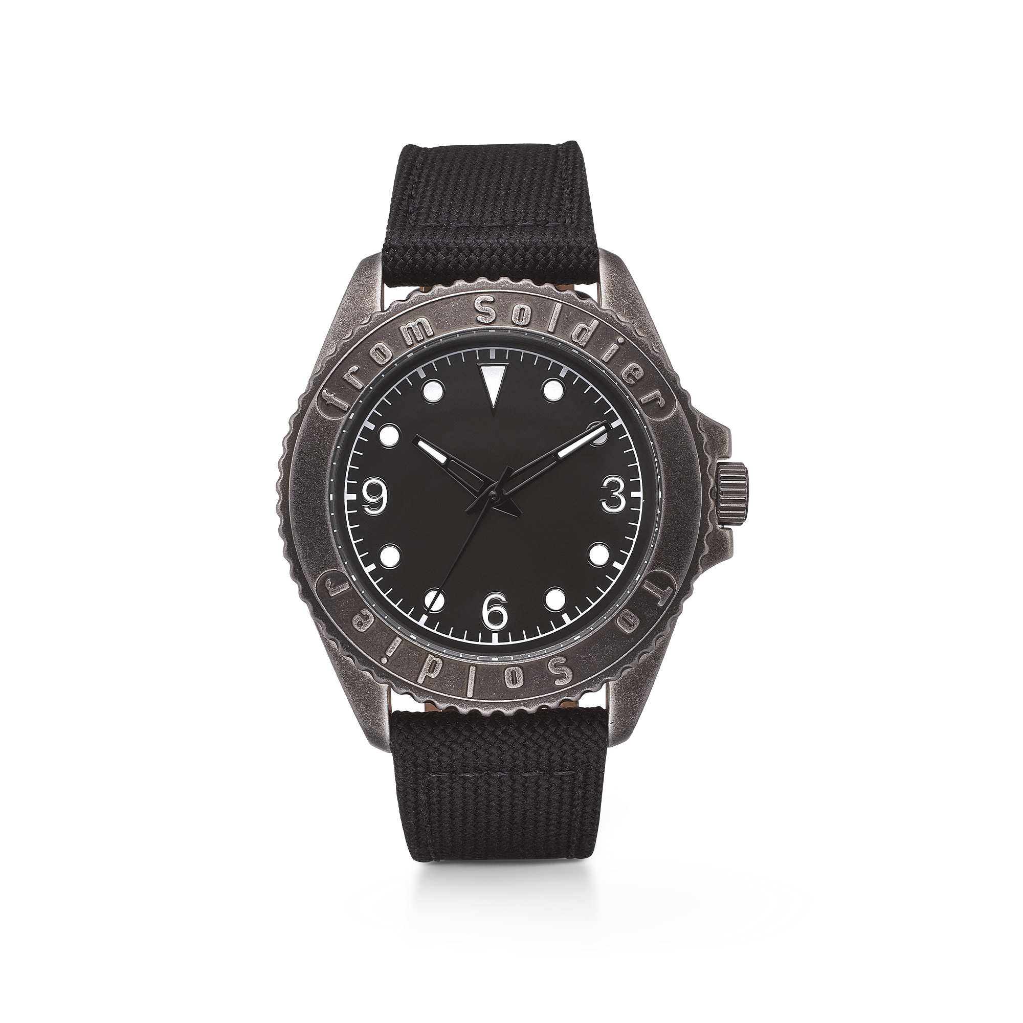 Black canvas strap watch with "from Soldier to Soldier" engraved bezel and white markers.