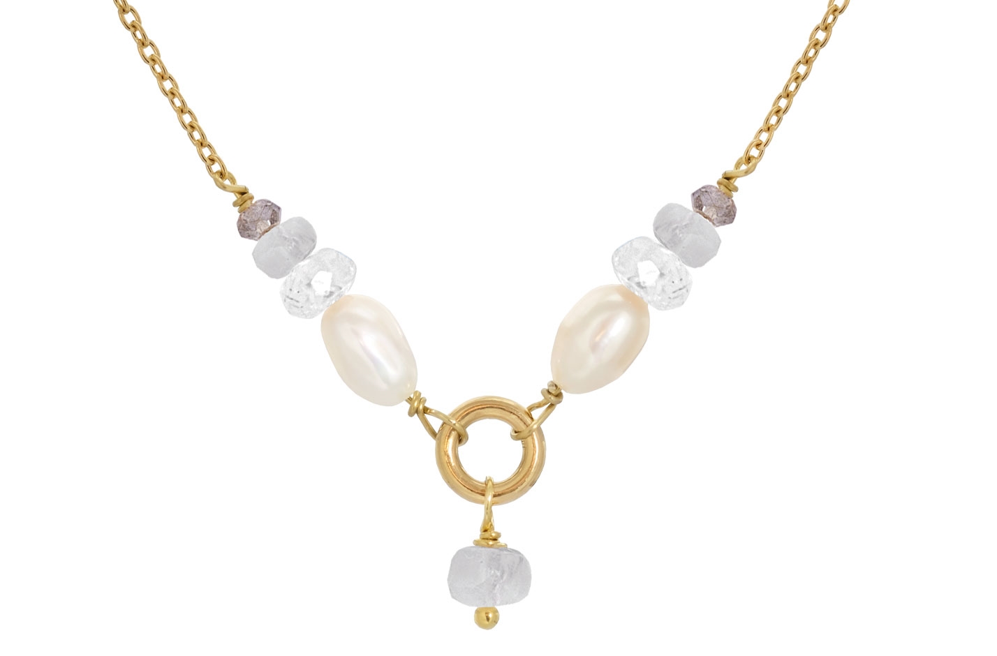 This exquisite Rabinovich necklace showcases a harmonious blend of white freshwater pearls, vibrant peridot, and serene apatite and aquamarine stones. The combination creates a sophisticated palette that stands out at black-tie galas and formal occasions, while the gold-plated sterling silver setting adds a luxurious finish that catches the light beautifully.