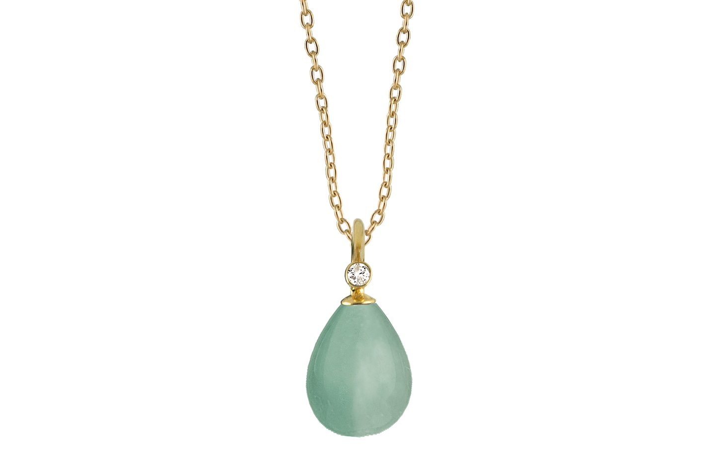The Rabinovich Contessa necklace showcases an exquisite teardrop aventurine pendant, enhanced by a brilliant diamond accent. This masterfully crafted piece combines the unique mint-green hue of aventurine with the enduring luxury of 14kt gold, creating a sophisticated statement that transitions effortlessly from day to evening wear.