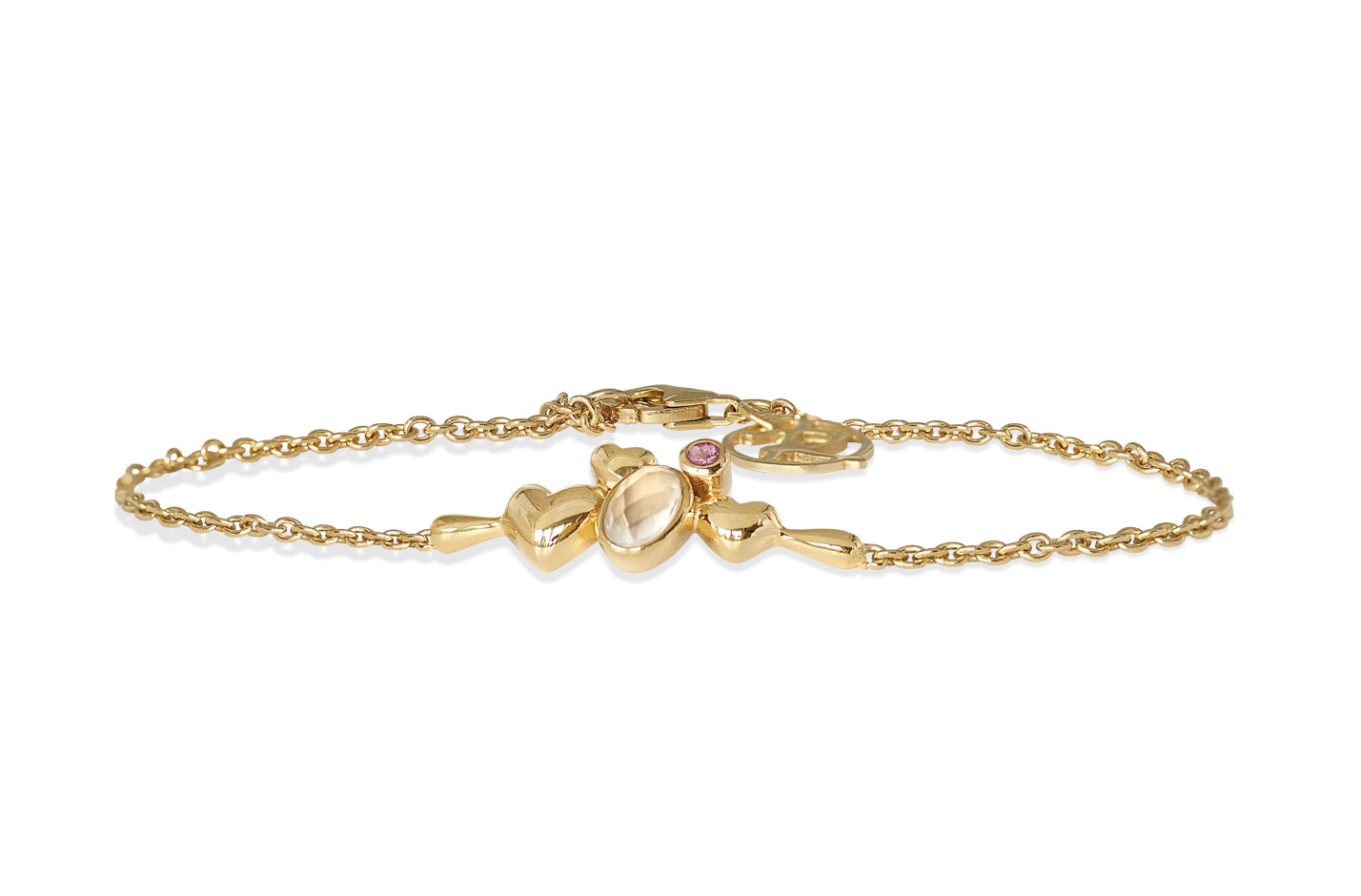 Crafted in gold-plated sterling silver, this Rabinovich bracelet showcases exquisite artistry through its heart-shaped elements and precious stones. The centerpiece features a 6x4 mm white moonstone that catches light beautifully, complemented by a delicate 2 mm pink tourmaline that adds a subtle touch of color.