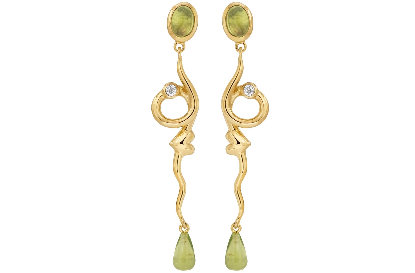 The Rainforest Dew earrings showcase exquisite dual peridot stones: a 6x4mm oval at the top and a 7x4mm teardrop at the base. The flowing, curved design creates an artistic statement, perfect for formal events where sophisticated style matters. A delicate 2mm zirconia accent adds subtle sparkle.