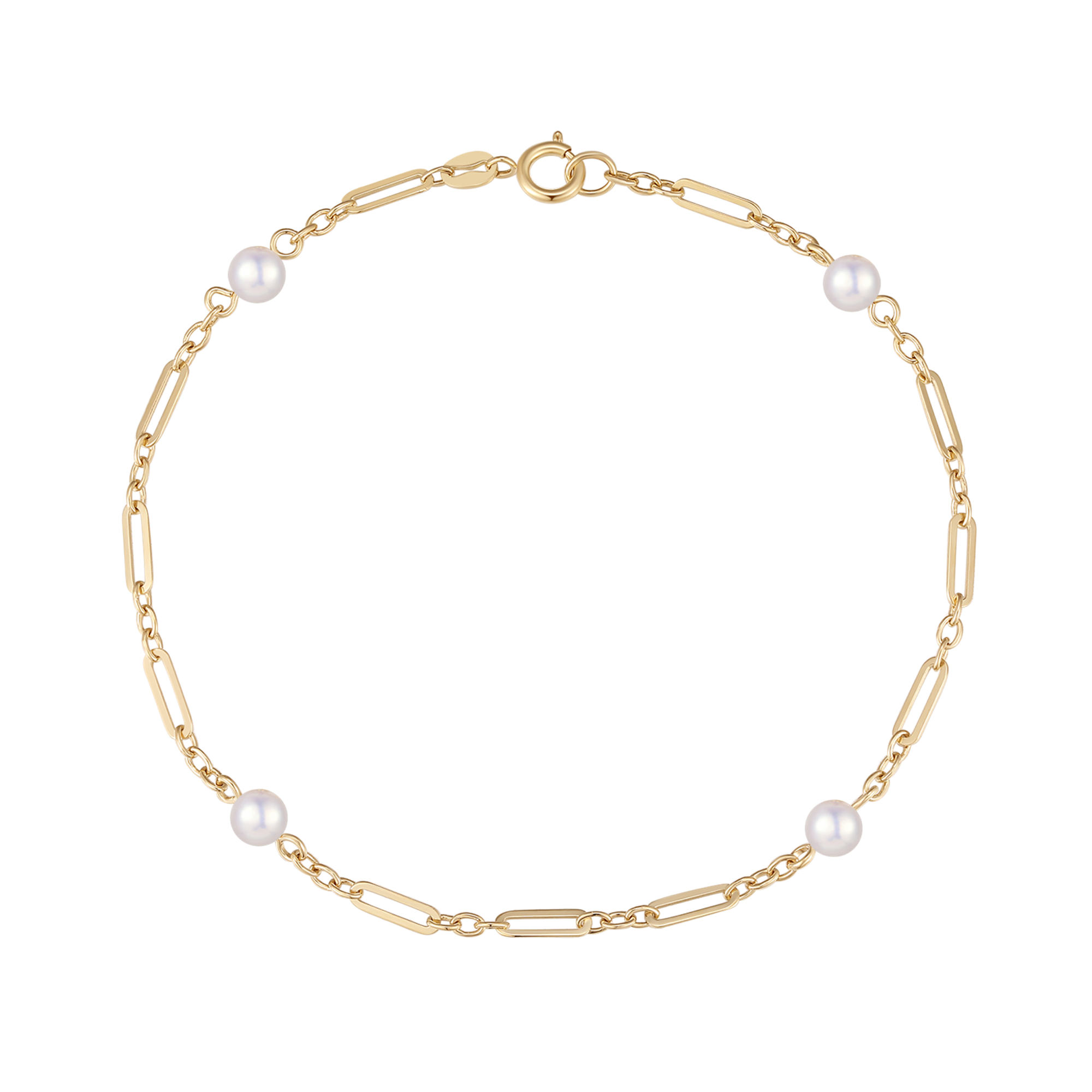 Gold bracelet with chain links, four white beads, and a clasp for fastening.