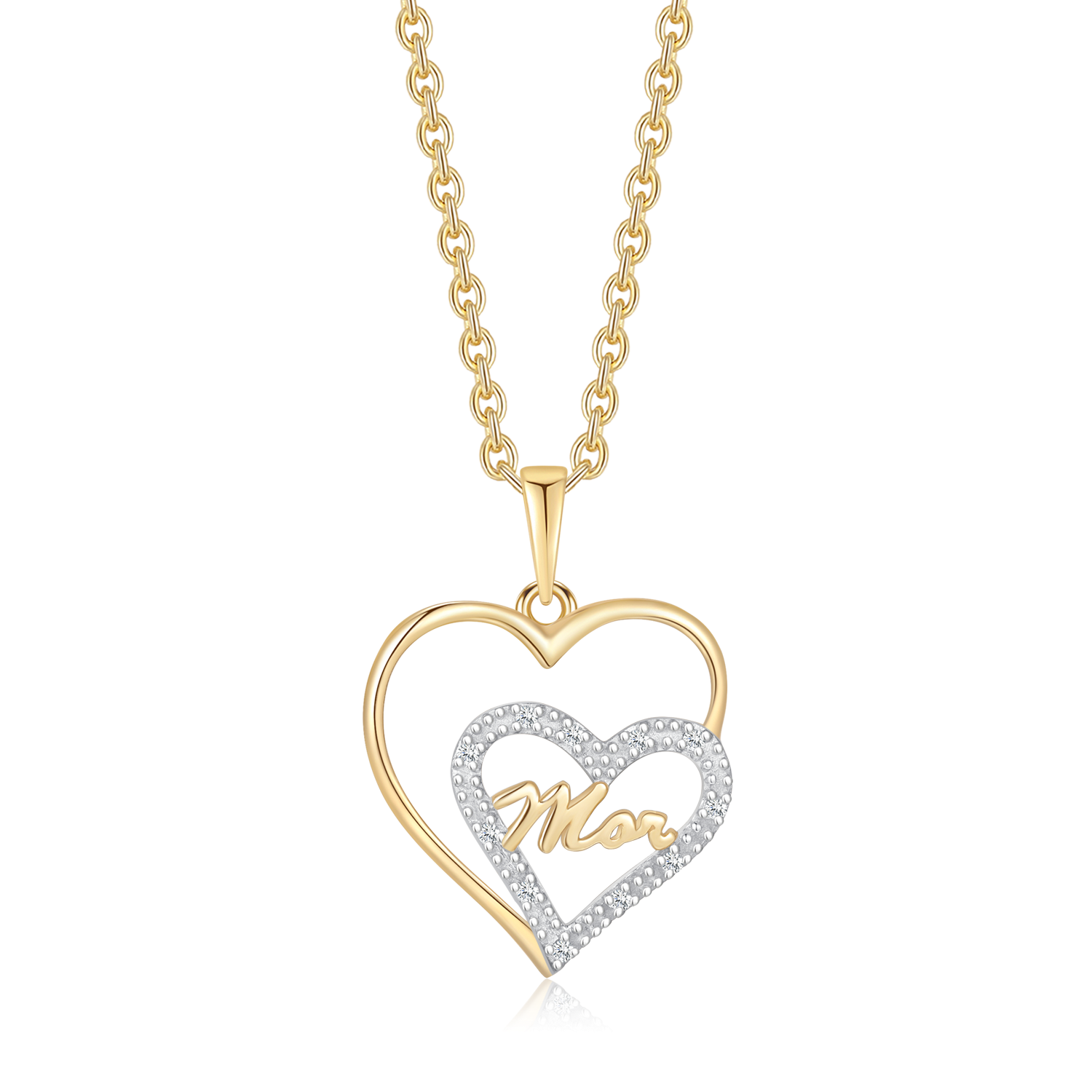 8 kt. guld vedhæng dobbelt hjerte med "Mor" og syntetiske cubic zirconia.