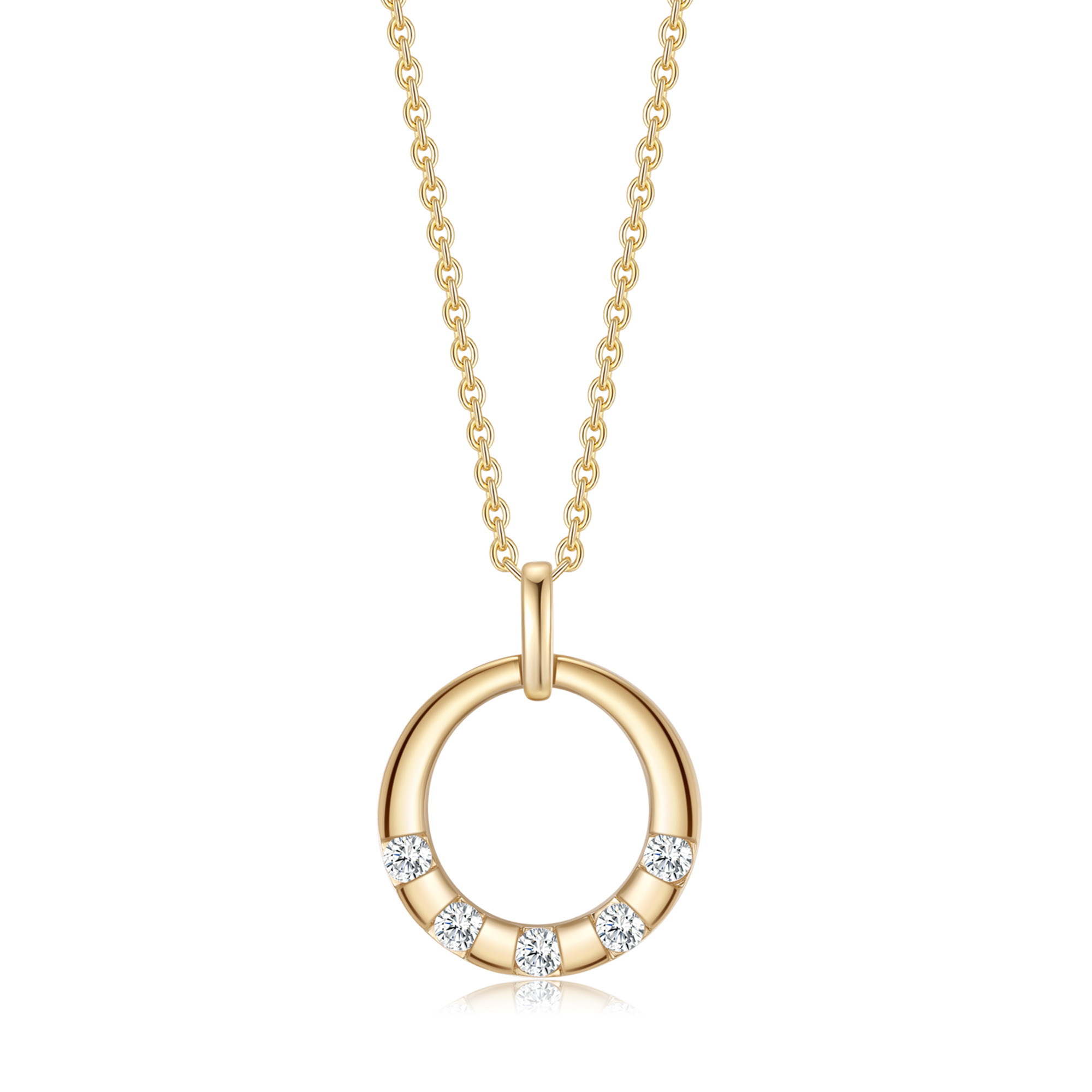 14 kt. guld vedhæng cirkel med 5 syntetiske cubic zirconia i mellem firkant.