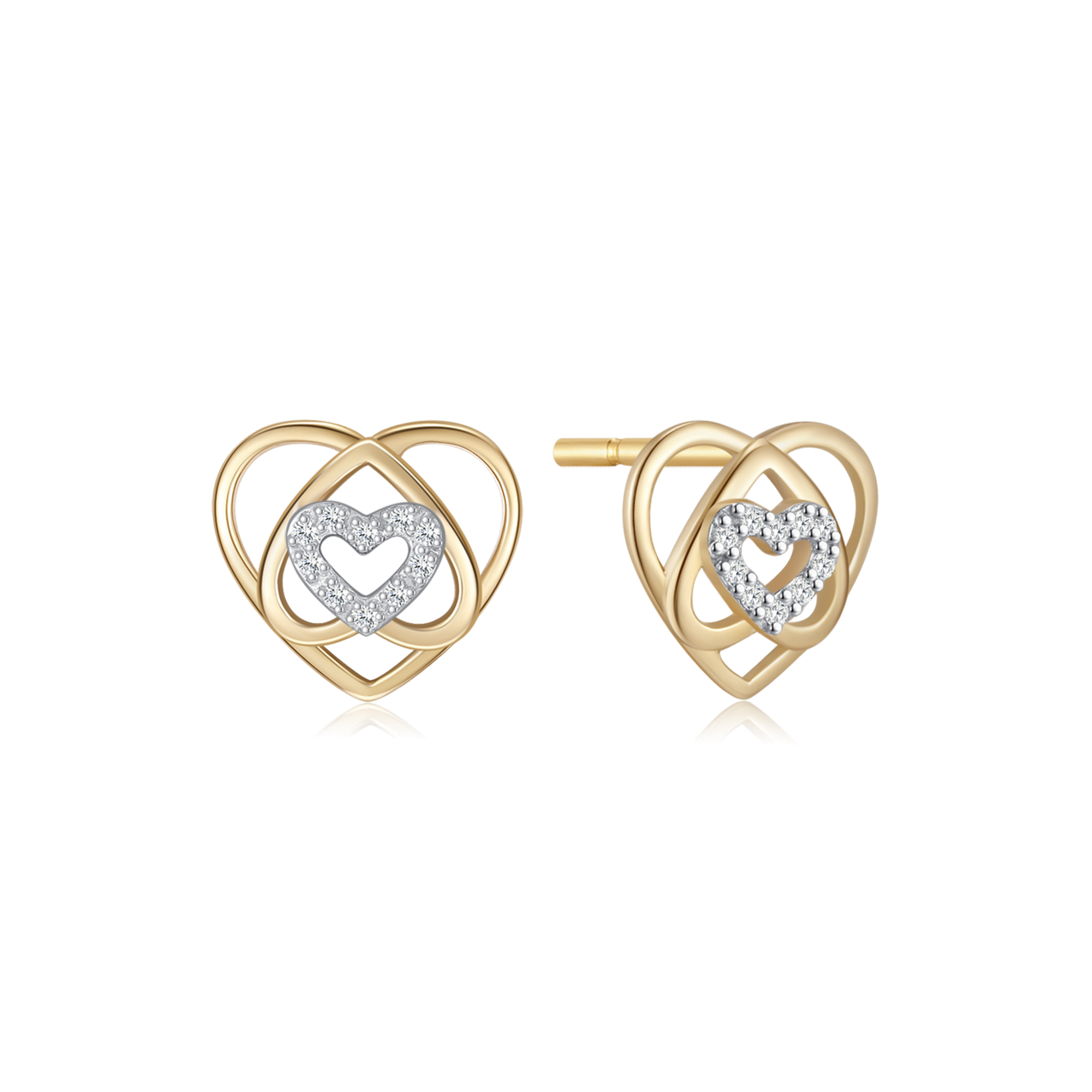 Gold interlocking heart earrings with stone-embellished inner hearts and post-style backings.