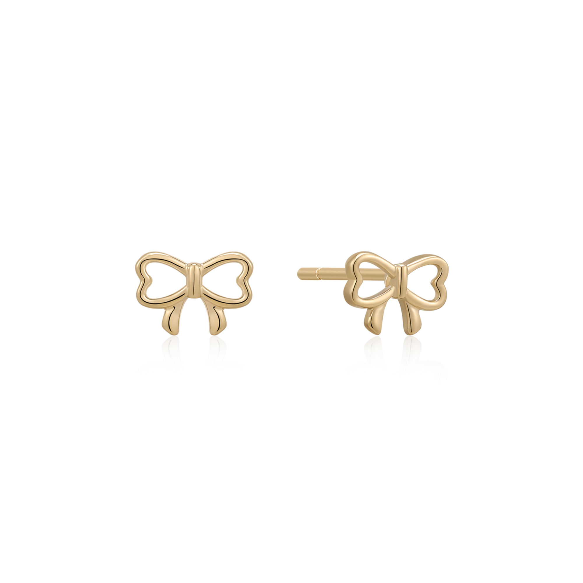 Gold bow-shaped earrings with a polished finish; earring posts visible at the back.