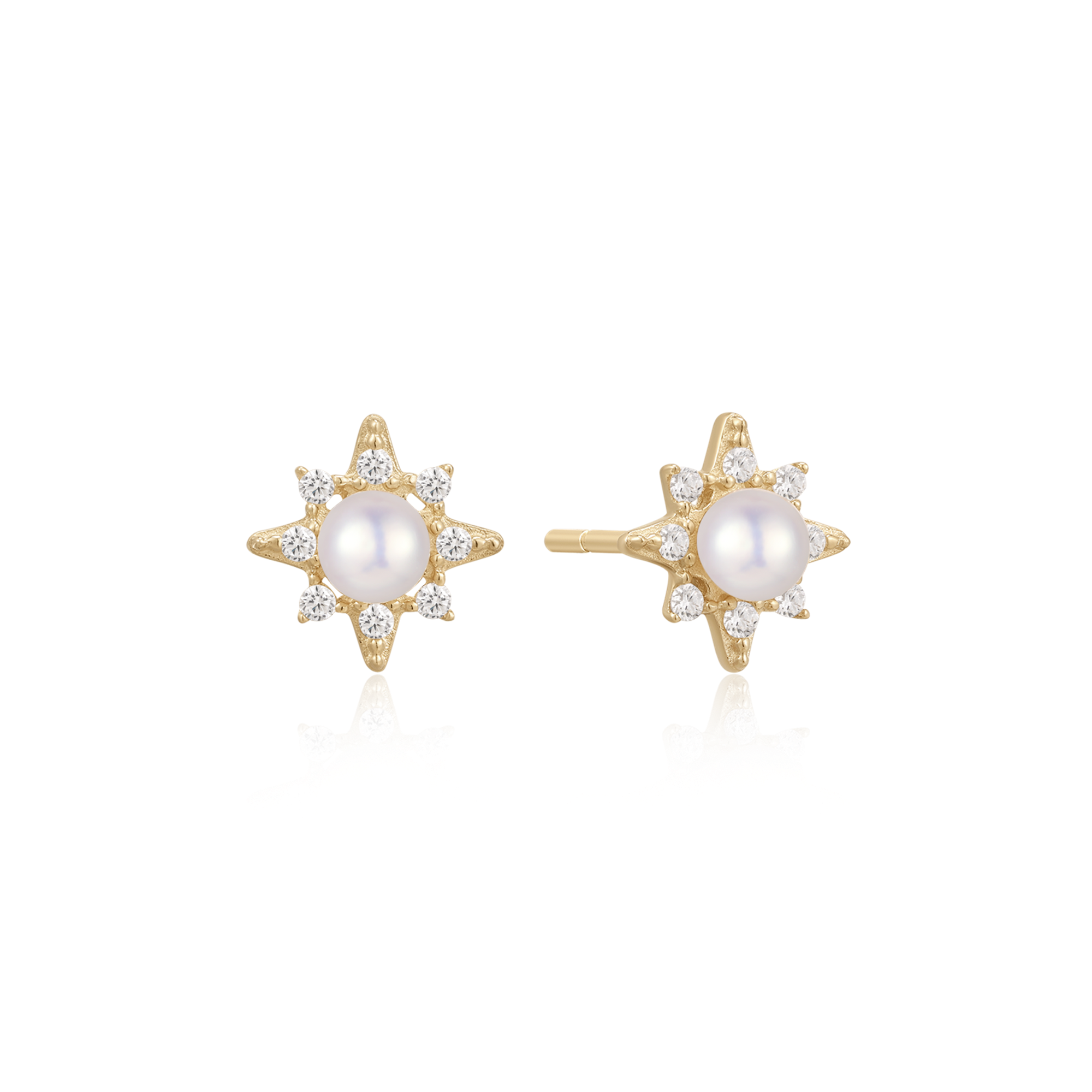 Star-shaped gold earrings with central pearl and diamond-like stones from Støvring Design.