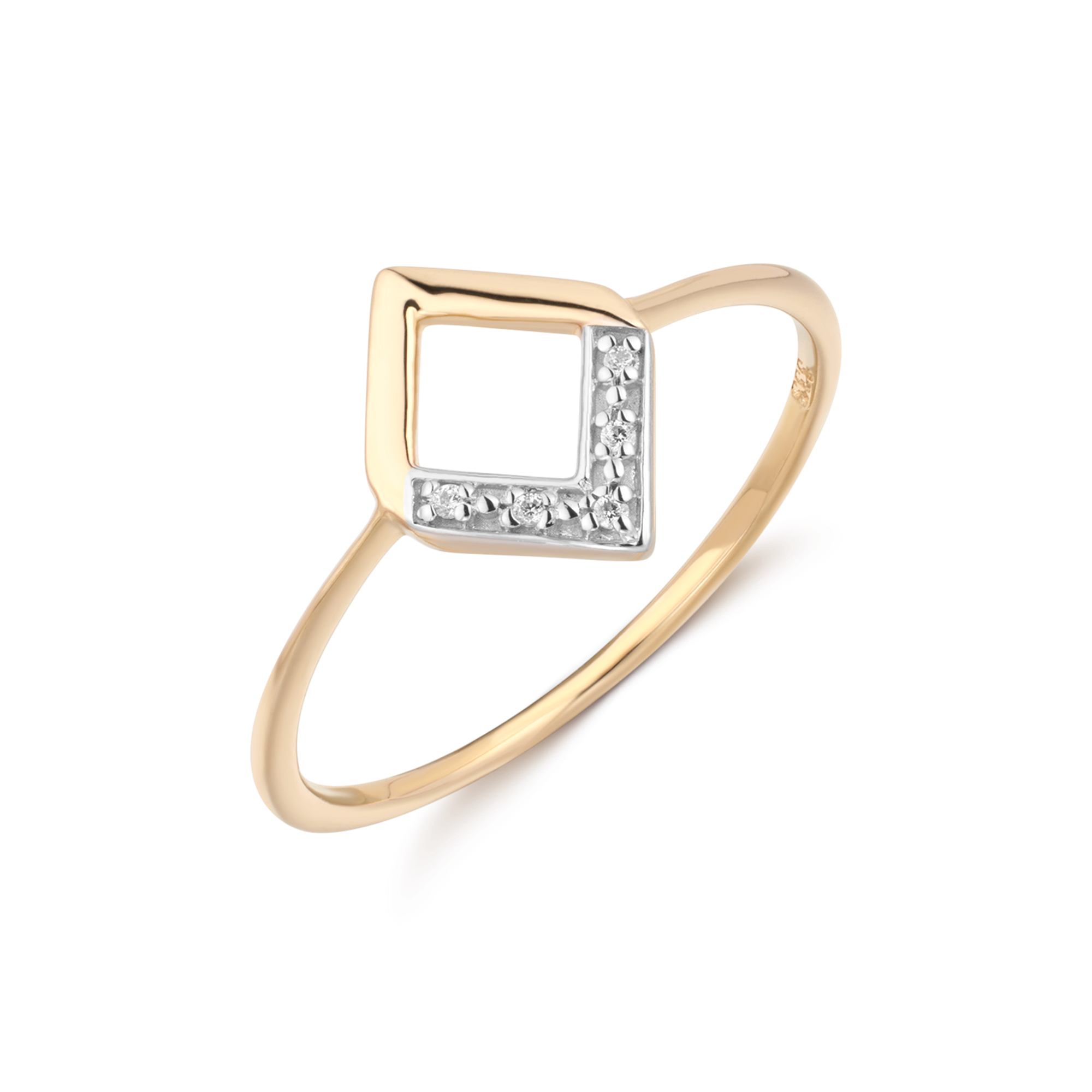 Gold ring with a square design, open center, partial stones on one side, and a thin band.