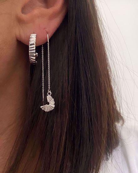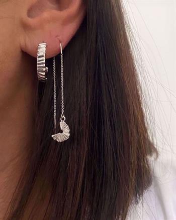 Ribbed, textured, partial hoop earrings with a sleek, silver finish, moderate in size.