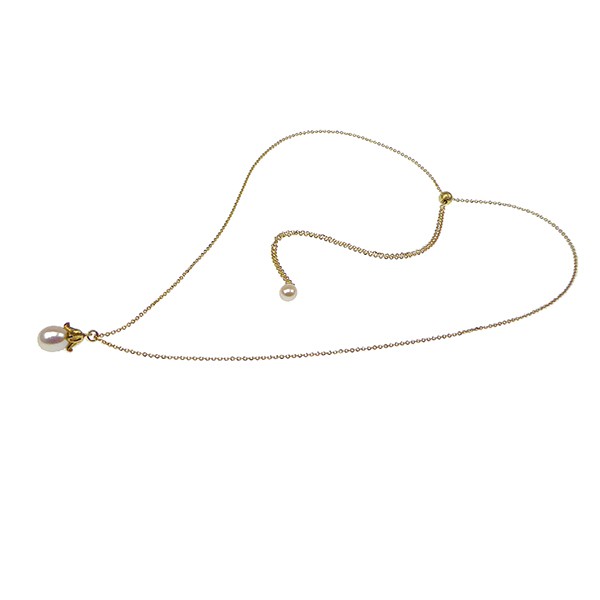 Et smukt & kreativt kædedesign hvor længden justeres trinløst med Magic Bead/kuglen med silikonekerne.Kæden er 2 farvet i forgyldt/blank Anker Facet, samt ferskvandskulturperler foran og bagved.Kæden hænger smukt foran og samtidigt bag på ryggen, og kan vendes rundt og alt udført i Sterlingsølv.