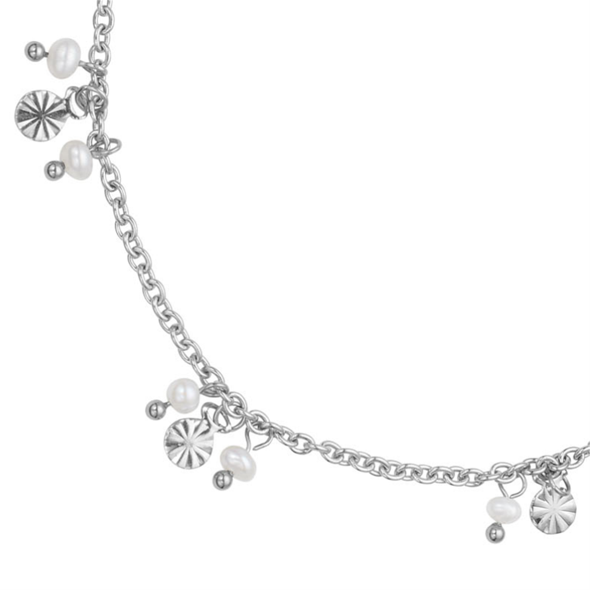 Halskæde i stål med ferskvandskulturperle. Halskæden er 42 cm + 3 cm forlænger.