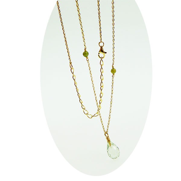 Halskæde i 42cm længde med ekstra 8cm forlængerkæde med Prasiolit/Grøn Ametyst vedhæng i str. 12x8mm i flot facetteret udførelse.Kæden er vores populære 2 farvede anker facet i 0,5mm trådtykkelse - der yderligere er facetteret på siderne - så det ligner en masse glimtende sten - meget spændende med 2 isatte Rå Diamanter ! Alt udført i Sterlingsølv/18 karat Forgyldt