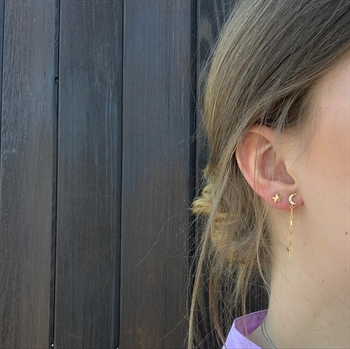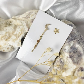One earring is a star-shaped stud, while the other is a long earring with both moon, stars and white zirconia on it.