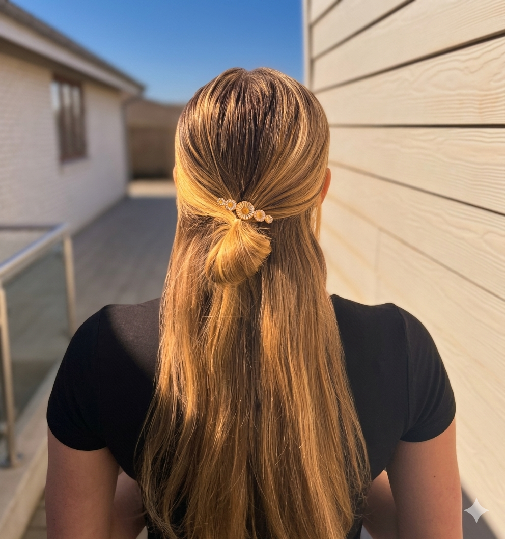 The hair clip is decorated with 5 beautiful daisies on these sizes: 1 x 18 mm, 2 x 11 mm and 2 x 7,5 mm.
