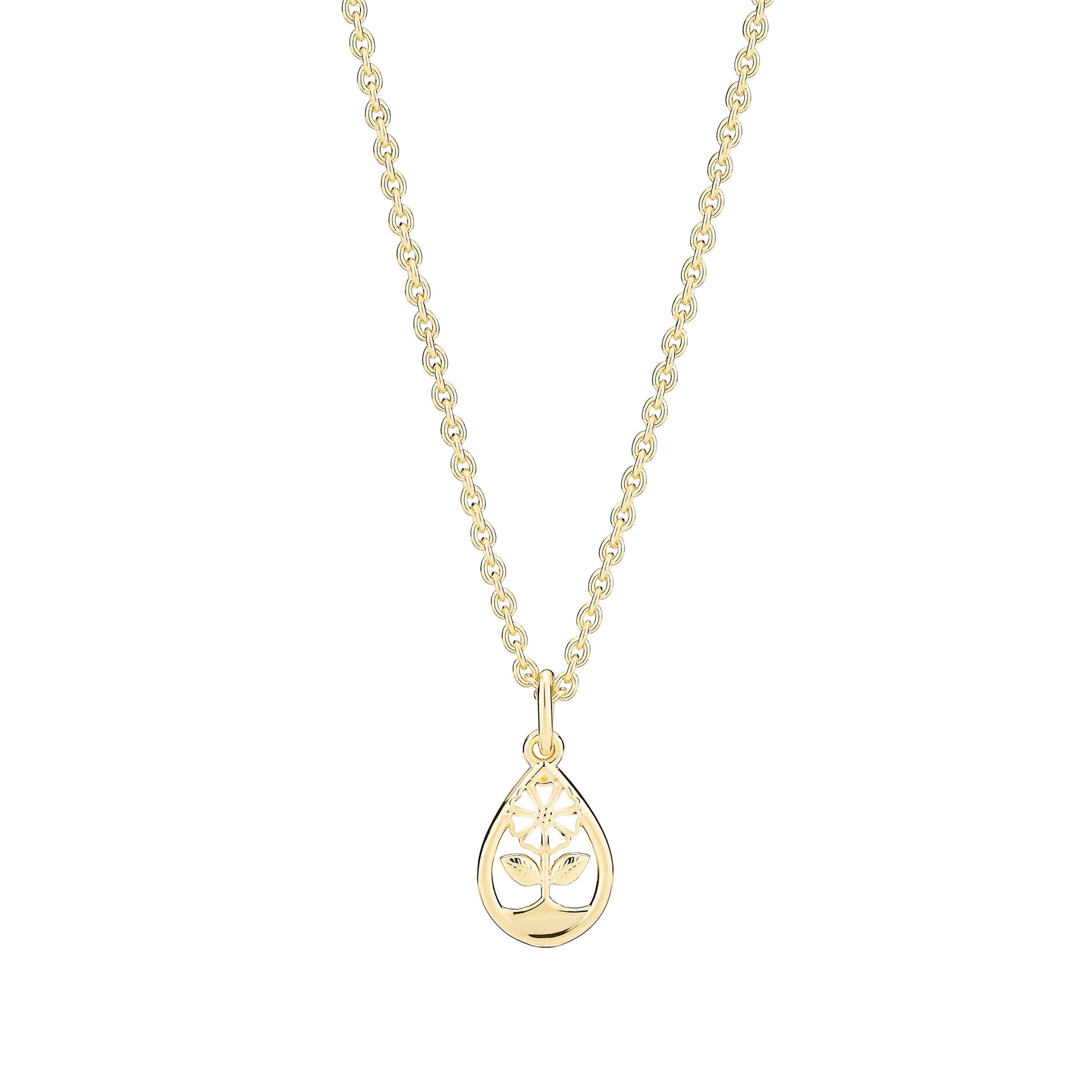 Gold teardrop pendant with floral design on a linked chain, polished finish.