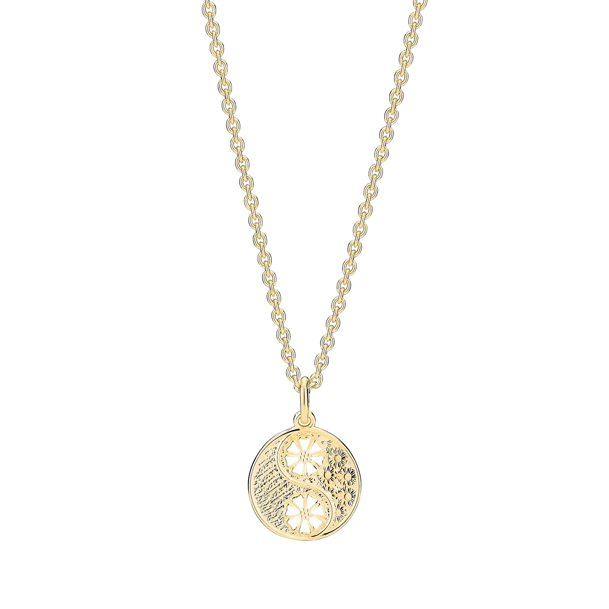 The Marguerit collier features an exquisite Yin Yang design adorned with delicate daisy patterns, creating a unique blend of spiritual symbolism and floral elegance. Crafted by Lund Copenhagen in gold-plated silver, this necklace offers both refined aesthetics and lasting quality for daily wear.