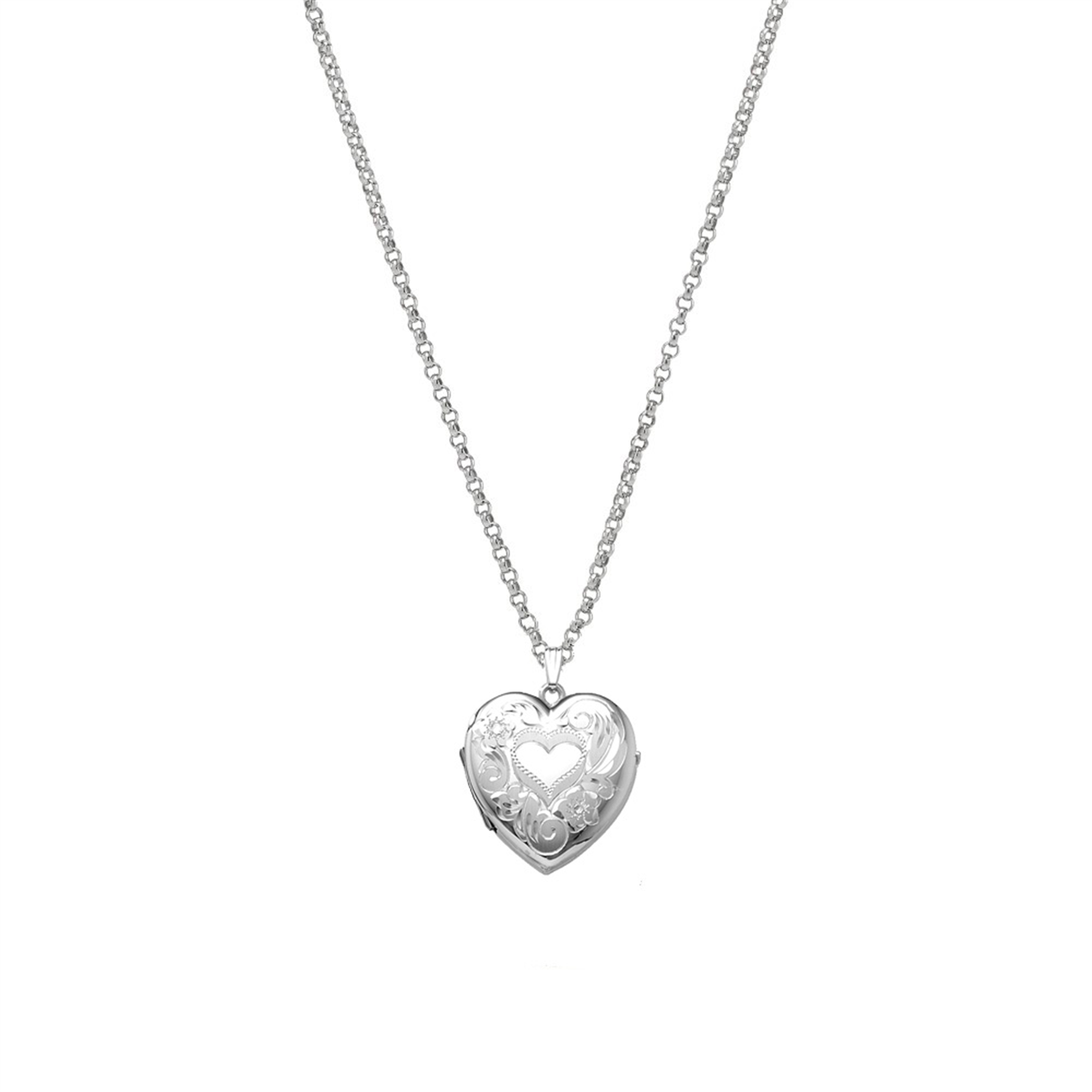 Eventyrlig og romantisk hjertemedaljon i rhodineret sølv. Medaljonens forside er prydet med et ciseleret hjerte- og blomstermotiv, mens bagsiden er blank. Der er plads til fire billeder inden i medaljonen. Vedhænget måler 26 mm i højden og 25