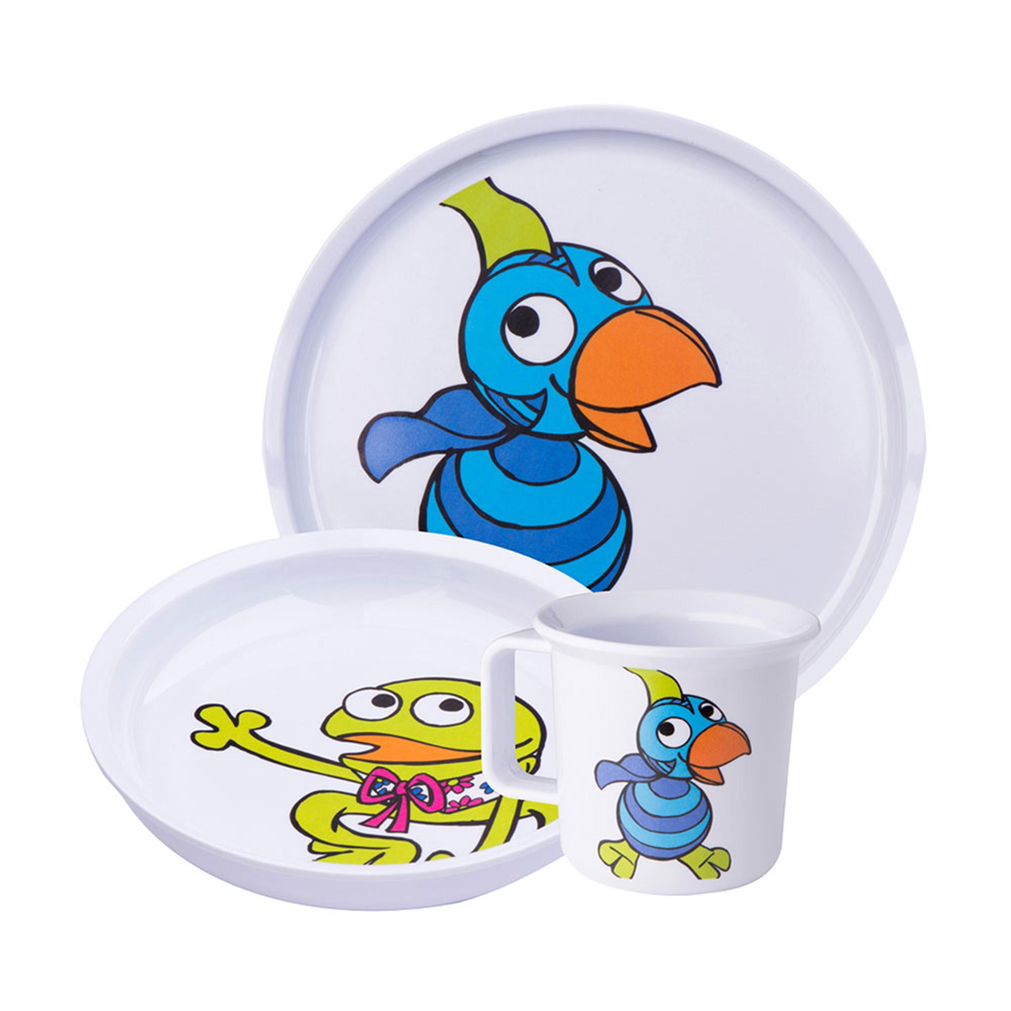 Super elegant og fint melamin barnesæt bestående af tre dele med motiver fra den kendte danske børne-tv-serie Kaj og Andrea. Frøen Kaj elsker jazz og papegøjen Andrea elsker solsikkefrø. De kan også ret godt lide hinanden og driller hinanden kærligt. P