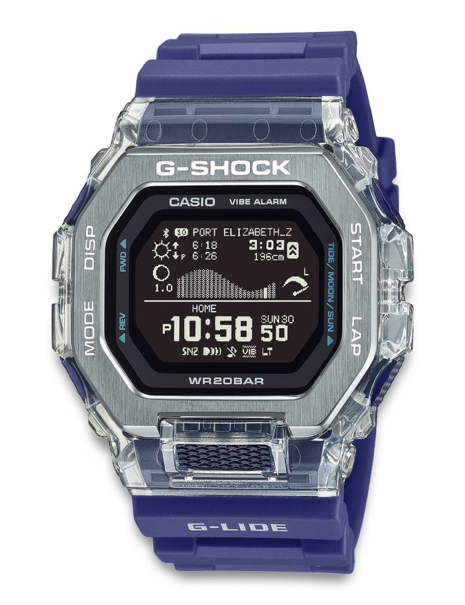 The Casio GBX-100S-2ER from the G-Lide series is designed for surfers and water sports enthusiasts. Featuring Bluetooth connectivity, tide and moon data, and G-Shock toughness, it’s ready for both the ocean and daily life.