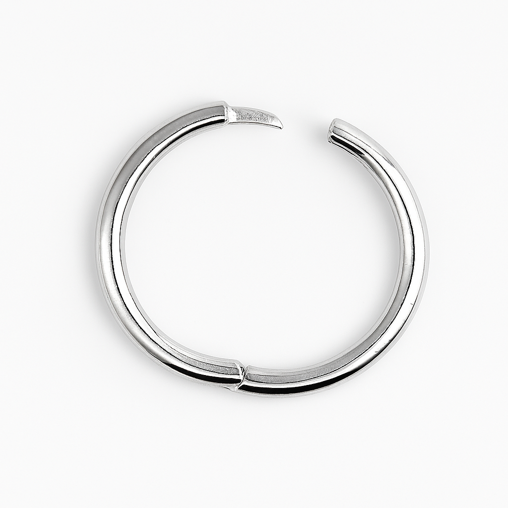 PIERCE52 creol in rhodium-plated sterling silver. The creole measures 10 mm in diameter and 1 mm in thickness.