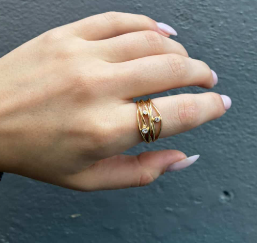 Beautiful ring of thin threads with glittering topaz in elegant settings.,