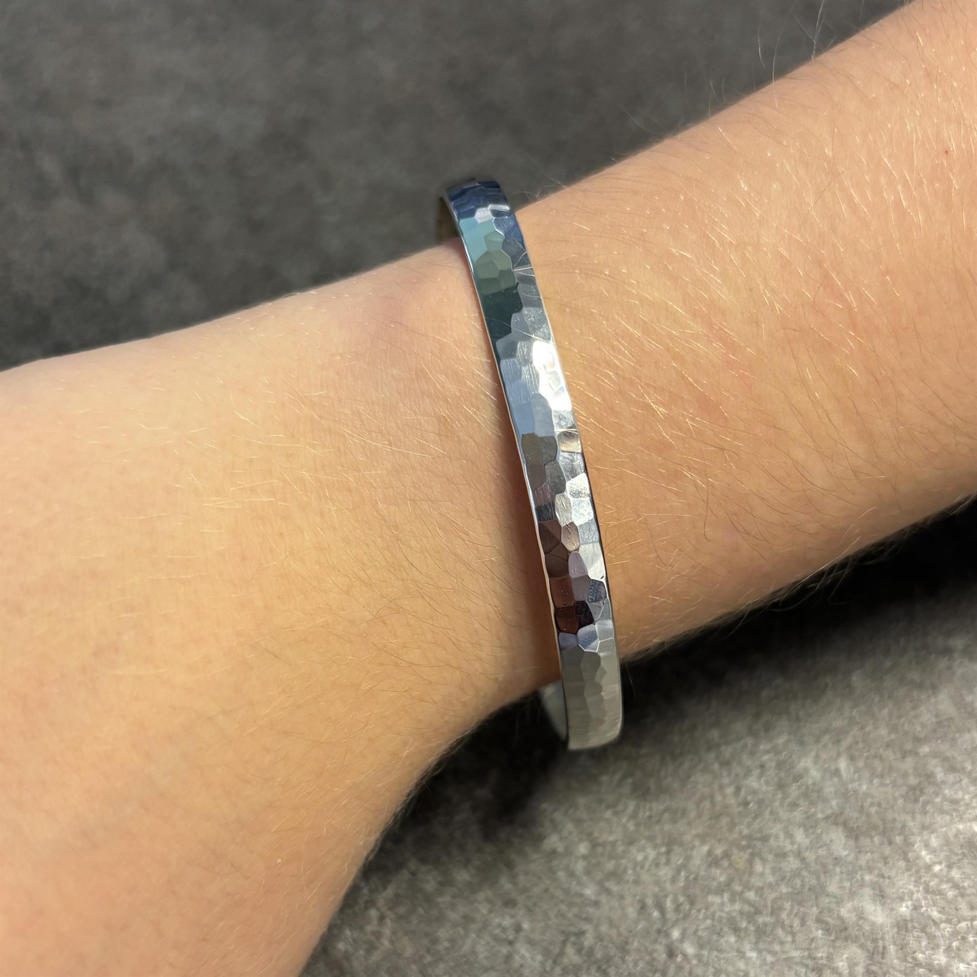 Simple bracelet in solid silver with hammered surface, 6.0 mm A delicious handmade design of the best quality from goldsmith and owner of Randers Sølv, Troels Tvenstrup. The bracelet is made of solid silver, has a wide band and a hammered surface that helps to give the whole piece a raw look.