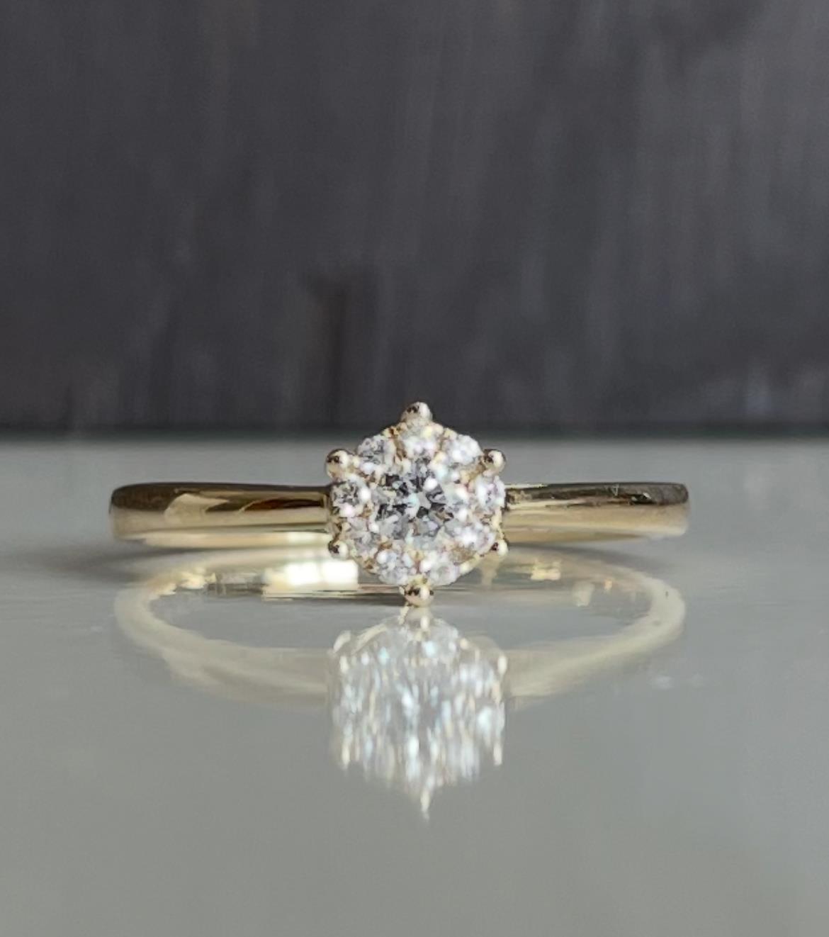 Gold ring with a star-shaped diamond setting, reflecting elegantly on a smooth surface.