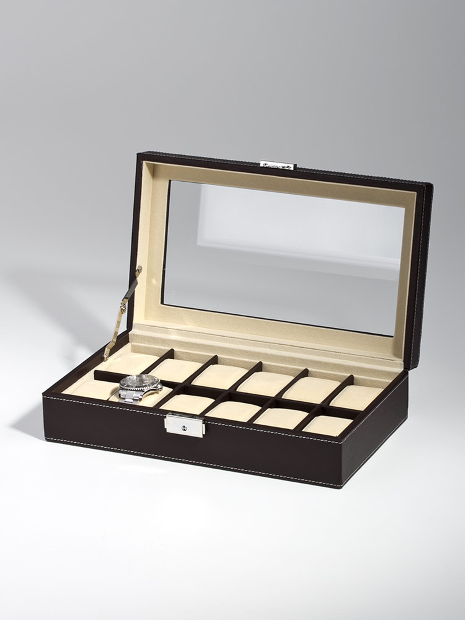 Store your collection in style with the Rothenschild Watch Box in sophisticated brown, accommodating 12 timepieces. Featuring a glass lid and secure locking mechanism, it balances elegance with protection.