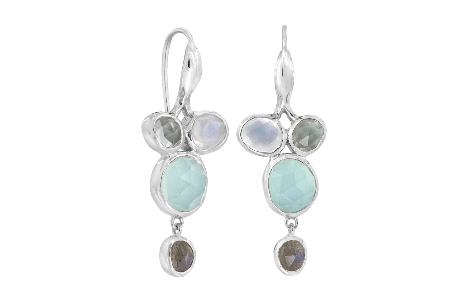 Crafted from premium sterling silver, these Rabinovich earrings showcase an exquisite arrangement of genuine gemstones. The centerpiece, an 8x7 mm chalcedony stone, creates a stunning focal point, complemented by a 6x5 mm rainbow moonstone that displays enchanting plays of color. The design harmoniously incorporates aqua blue quartz and labradorite stones, each measuring 5x4 mm.