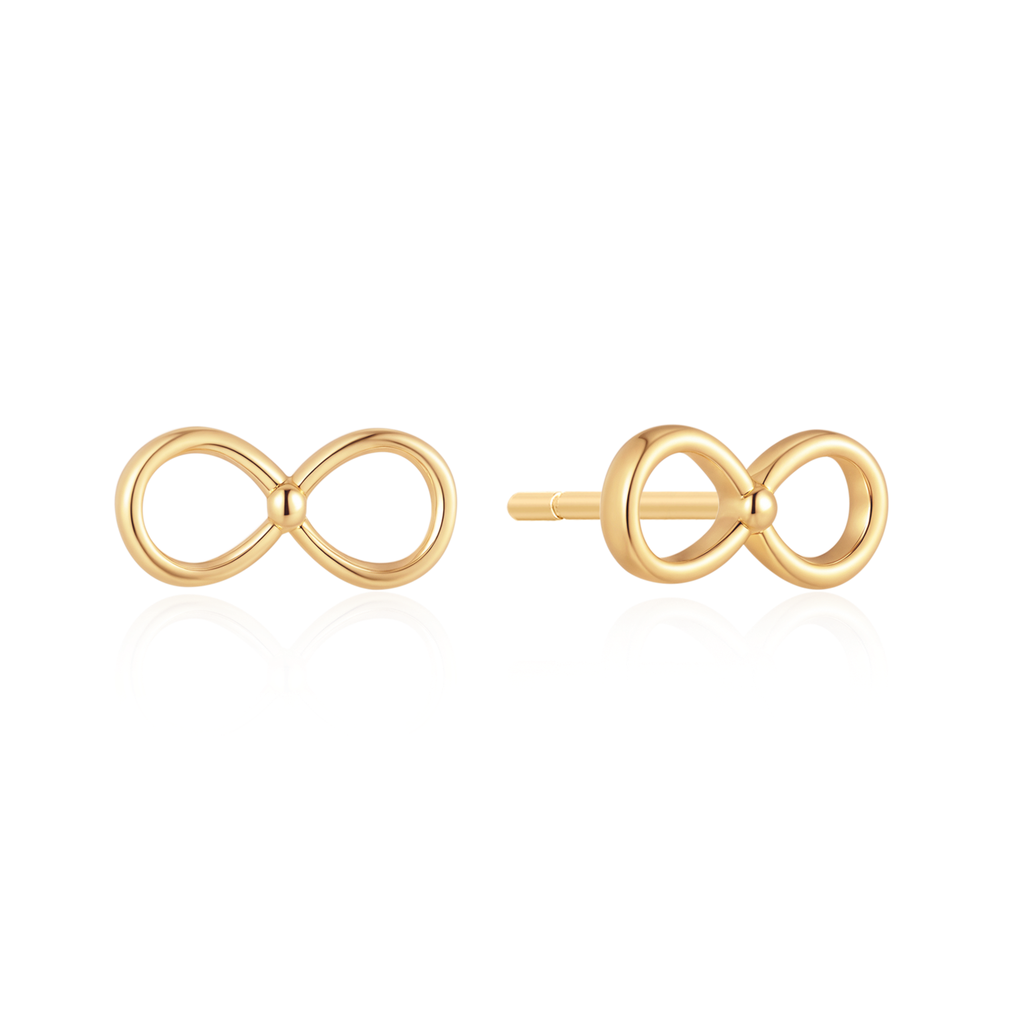 Gold-finished stud earrings with infinity symbol design and post back, reflecting light elegantly.