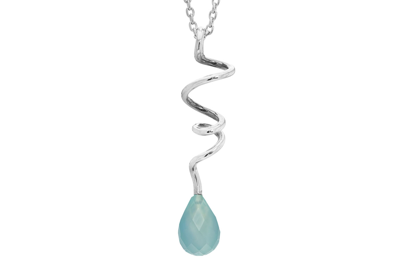 The Sølv collier features a stunning 10 x 7 mm faceted chalcedony stone, its soft blue hue perfectly complementing the unique spiral design. Ideal for formal events and cultural gatherings, this artistic piece draws attention while maintaining sophisticated elegance. The distinctive pendant design expresses individuality without overpowering your ensemble.
