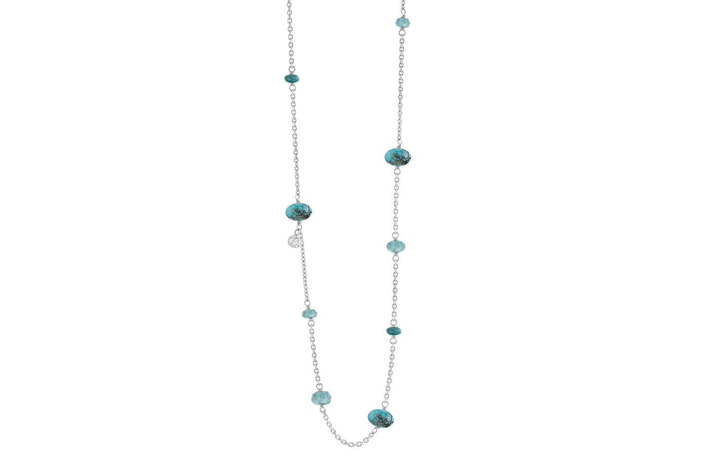 The Minetta necklace showcases a mesmerizing gradient of apatite, blue topaz, turquoise, and zirconia stones. Each stone is thoughtfully arranged in varying sizes, creating an asymmetrical design that draws attention at social gatherings and artistic venues. The sterling silver chain provides an elegant backdrop for this dynamic stone arrangement.
